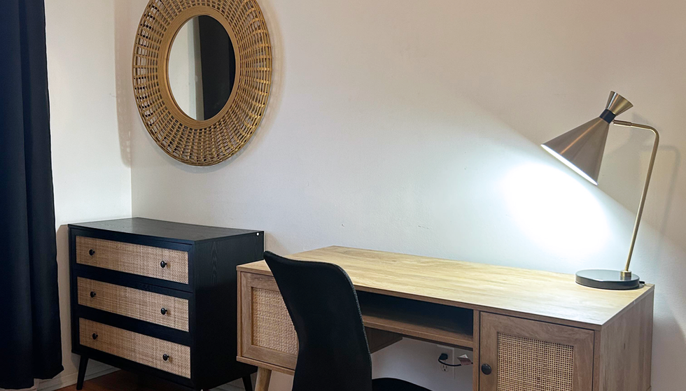 La chambre Classique & Exotique s’inspire d’un style épuré et naturel 🌿. Rotin, cannage et métal noir dialoguent avec le parquet miel pour créer une ambiance chic, nette et intemporelle, pensée pour étudier avec calme.